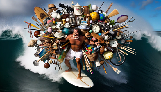 一张照片中,一位皮肤古铜色的中年波利尼西亚男性冲浪者奋力冲浪,手里拿着50 件物品,包括茶杯、自行车、雨伞、烛台、口琴、地球仪、笔记本、羽毛、秒表、棋盘、弹珠、围巾、灯笼、画笔、凉鞋、指南针、望远镜、扳手、花瓶、溜溜球、鹅毛笔、水壶、书包、贝壳、挂坠盒、铅笔、日晷、卷尺、算盘、袖扣、保龄球、口哨、抹刀、抹刀、沙漏、大礼帽、笛子、显微镜、拼图游戏、放大镜、飞盘、陀螺、手电筒、跳绳、开罐器、风铃、盆景树、擀面杖、热水瓶和打字机等。海浪在他周围拍打,他的表情充满痛苦和轻微的恐慌,并试图平衡物体和他的冲浪板。