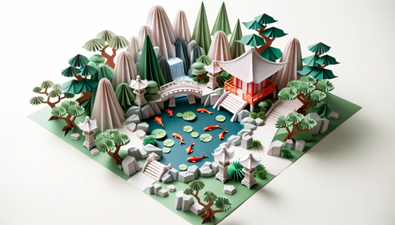 精致纸张上的剪纸插图,略有磨损,错综复杂的 3D 立体弹出式花园,配有锦鲤池和石灯笼,通过精确的切割和折叠使自然场景栩栩如生,雕塑设计艺术。
