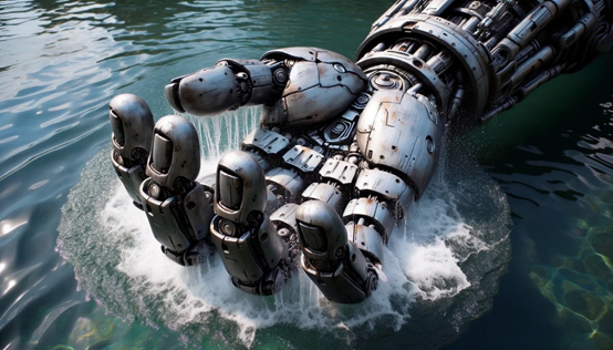 巨型机器人的手的特写照片,细节复杂,磨损迹象明显,溅入清澈的河水中。飞溅产生的涟漪扩散开来,反射阳光。手部的金属表面有划痕和凹痕,显示出其年代感。