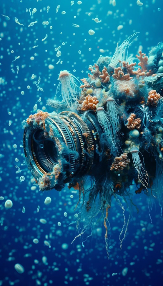 由珊瑚和水母制成的相机,沉浸在广阔的蓝色海洋深处。相机的外表面饰有珊瑚和闪亮的金色金属装饰。深蓝色的背景上充满了微小的漂浮微生物,采用高质量的光学器件进行描绘,使图像具有胶片颗粒纹理和柔和的色彩。
