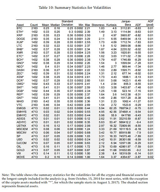 在整个样本期间,比特币的价格变化很大。所有分析过的加密货币都显示出正偏度,这意味着极端的正收益多于负收益,这可能是由于加密货币历来倾向于在价格快速上涨后出现(较少出现)暴跌。相比之下,大多数金融资产也表现出正偏度,但程度低于加密货币,一些金融资产表现出负偏度(如某些债券指数和贸易加权美元)。此外,大量加密资产显示出异常高的峰度,表明尾部较厚,因此相对于正态分布风险更高。相比之下,金融资产的峰度往往要低得多,这些结果突出表明,与其他金融资产相比,加密资产经历极端波动的可能性更大。
