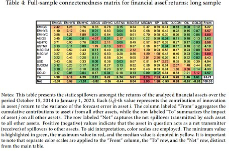 在文章的样本中,金融资产溢出指数的最大幅度飙升发生在2020年春季COVID-19大流行病的初期阶段。大流行病引发了一波不确定性,导致股市暴跌(图2中的事件4)。标准普尔500指数大幅下跌34%,从2月19日的最高点到3月23日下跌了1145点。波动率和收益溢出效应都达到了历史最高水平,峰值分别为81%和93%。然而,由于全球各国央行和政府采取了旨在刺激经济和稳定金融市场的特殊政策应对措施,股灾迅速得到扭转。2020年下半年,在支持性措施的推动下,大牛市开始出现。因此,在大流行病的剩余时间里,溢出指数逐渐下降。2022年2月,俄罗斯入侵乌克兰,外溢指数恢复上升趋势。这一地缘政治事件,特别是其对商品市场的影响,重新引发了整个市场的溢出效应,因为参与者对不确定性增加的影响做出了反应。