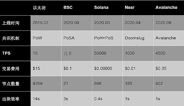 虽然以太坊在现在的公链市场中仍然占据绝对的领导地位,但后来者不断地加入,特别是在性能上和构架上不断地超越和推陈出新,在一定程度上还是动摇了以太坊的市场占有率。以下是2020年之前(以太坊2.0升级前)的几条主要公链的性能和数据对比,以太坊在各项数据(TPS、交易费用、出块效率等)都不占优势,如果继续放任发展,可以预见在不久将来无论在市占率和市值上面都容易被超越。