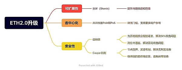 大家可能都听说过区块链的不可能三角,即去中心化、安全性和可扩展性,而以太坊2.0升级,针对这个三角的三个方面分别提出了应对方案,进而构建成了此次升级主线主要内容。