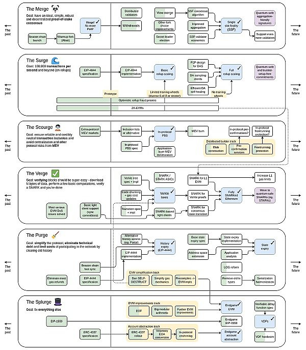 以太坊创始Vitalik Buterin以六个简洁的阶段来勾画未来的以太坊2.0升级路线:The Merge、The Surge、The Scourge、The Verge、The Purge和The Splurge。每个阶段围绕一个特定主题与功能的升级。