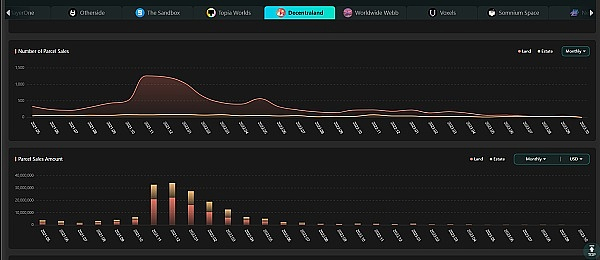 链游的另一大分支,就是所谓的“元宇宙”派系,以Sandbox、Decentraland为代表的,以元宇宙元素,卖地为主要经济模型的元宇宙类游戏。以Decentraland为例,它是一个基于以太坊的虚拟交易平台,用户可以在游戏中购买、收集和交易虚拟土地和资产。Decentraland利用NFT确保了虚拟资产的真实所有权。然而,游戏的优化不足,体验感较差,以及以太坊网络的性能限制也阻碍了游戏的进一步发展。在下图中可以看到,Decentraland土地的交易金额和数量从2021年底达到高峰(约3400万美元)后,不断下落,现在已不足高峰时期的1%。