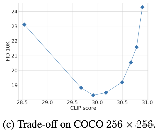 而关于CFG参数的选择,则是一个多次测试后再FID和CLIP之间权衡的结果(CLIP得分高相对于CFG强度增大)。