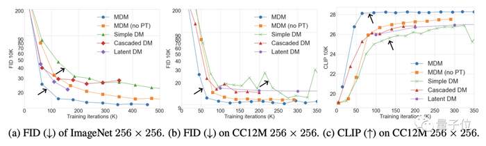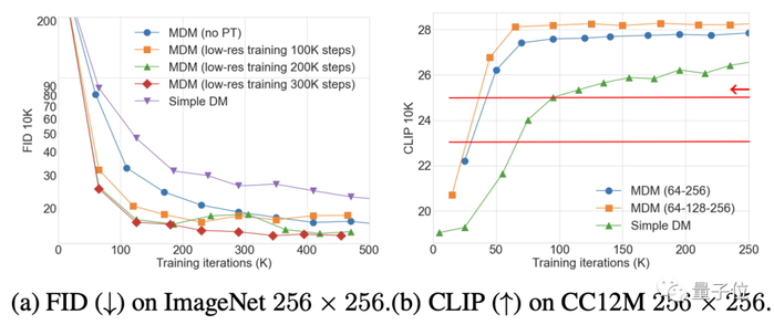 对于256×256分辨率的图像,在批大小(batch size)为1024的环境下,传统扩散模型需要训练150万步,而MDM仅需39万,减少了超七成。