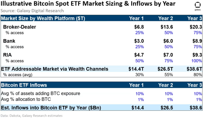 我们假设 RIA 渠道将从第一年的 50% 开始,到第三年增加到 100%。对于经纪商和银行渠道,我们假设从第一年的 25% 开始,稳步增加到第三年的 75%。基于这些假设,我们估计美国比特币 ETF 的可寻址市场规模在发布后的第一年约为 14 万亿美元,第 2 年约为 26 万亿美元,第 3 年约为 39 万亿美元。