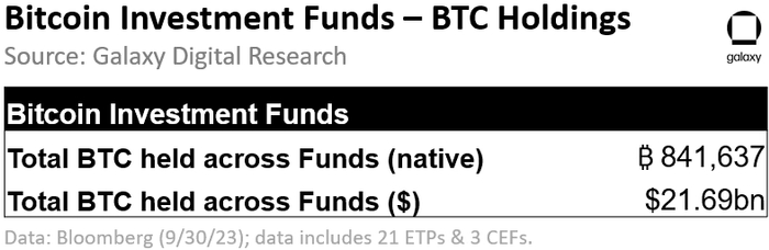 截至 2023 年 9 月 30 日,投资产品中的比特币(包括 ETP 和封闭式基金)总计为 842k BTC(资产管理规模约 217 亿美元),占发行总量的 4.3%。