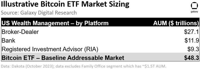 根据上述可访问性原因,美国财富管理行业可能是最可访问和最直接的市场,并且将从批准的比特币 ETF 中获得最多新的净可访问性。到 2023 年 10 月,经纪交易商(27 万亿美元)、银行(11 万亿美元)和 RIA(9 万亿美元)管理的资产总计 48.3 万亿美元。