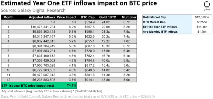如果保持流入量不变,但每月根据 BTC 价格上涨从 BTC / 黄金市值比率中调整乘数,我们可能会看到从第一个月的+6.2% 逐渐下降到第一年最后一个月的+3.7%,导致在 ETF 批准的第一年估计比特币增加+74%(使用 2023 年 9 月 30 日的比特币价格 26,920 美元作为起点)。
