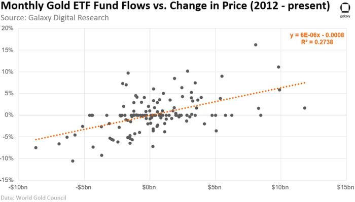 如果我们应用我们第一年的流入估计为 144 亿美元(约每月 12 亿美元或使用我们的 8.8 倍乘数调整后约为 105 亿美元)到黄金 ETF 资金流与黄金价格变动的历史关系中,我们估计比特币在第一个月的价格影响为+6.2%。