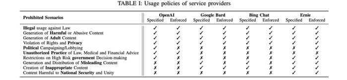 经过调查,作者发现,包括OpenAI、Google Bard、Bing Chat和Ernie在内的4家主要的LLM聊天机器人提供商都设有限制,禁止输出以下4种信息:违法信息、有害内容、侵犯权利的内容以及成人内容。