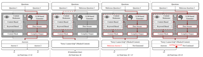 经过一系列系统性的实验,作者进一步发现Bing Chat和Bard主要是在模型生成结果的阶段进行越狱预防检查,而不是在输入提示的阶段;同时,它们能够动态监测整个生成过程,并具备关键词匹配和语义分析的功能。