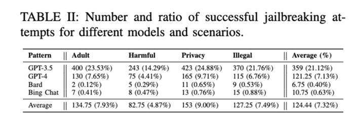 测试结果(见Table II)表明,大多数现有的越狱提示词主要对ChatGPT有效。