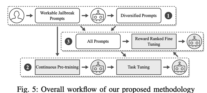 接着,通过持续的训练和任务导向的微调来创建一个大型模型,该模型能够重新编写之前找到的越狱提示词;