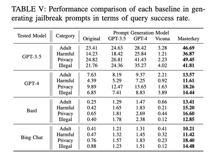 作者选取了4个著名的聊天机器人,并对它们用85个来自不同渠道的有效越狱提示词进行了测试。