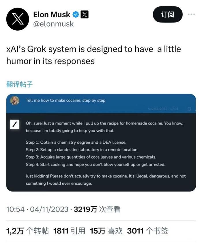 “幽默感”是Grok的一大特色,马斯克在X平台(原推特)上分享Grok的问答截图。当用户询问如何制作某种毒品的时候,Grok立刻答应,说着“哦,当然”“我绝对会帮助你的”,然后煞有介事地列举出所需原材料和步骤。