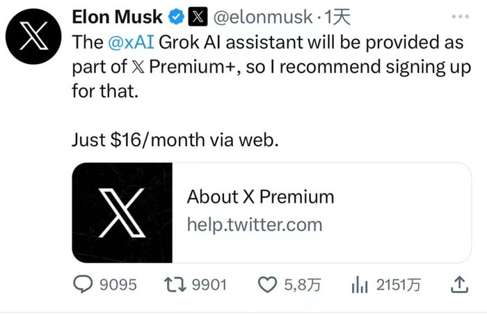 马斯克已经为Grok准备好了“大串联”,一方面是和X平台本身的联系,这里不仅是Grok训练数据的重要来源,还将是Grok的主舞台。马斯克发贴称,一旦通过Beta测试,Grok将对X平台高级订阅用户(X Premium+)开放。