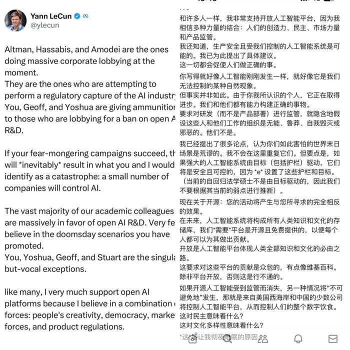 科技企业暗中拉锯,科技界观念和利益激烈碰撞。Meta的AI首席科学家杨立昆(Yann LeCun)前不久在X平台屡次发帖批评“大规模企业游说”,剑锋直指阿尔特曼以及DeepMind CEO哈萨比斯(Demis Hassabis)以及Anthropic CEO等人。杨立昆认为“求监管”的游说若取得成功,即监管使得开源人工智能平台消失,那将不可避免地使得AI被少数企业控制,而这对AI发展与人类文明都无益。