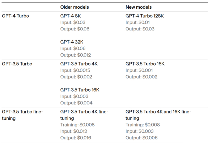 降价后的GPT-4Turbo输入token价格是GPT-4的三分之一,输出token价格是原来的二分之一;GPT-3.5Turbo 4K 精调版本输入token价格是此前的三分之一,输出token价格是原来的二分之一;GPT-3.5Turbo 16K精调版本输入token价格是之前的四分之一。