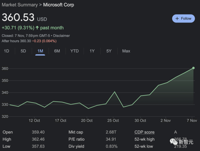 随着OpenAI的史诗级发布,微软的股价连续上涨8个交易日,并在周二收盘时创下360.53美元的历史新高。