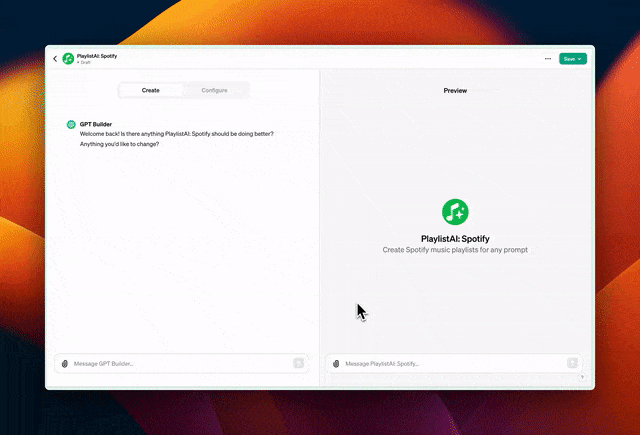 而将上网功能与自定义GPTs结合,则可以从自己最喜欢的音乐人中创建音乐播放列表。