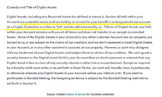 下划线的文字意思是,如果你是加拿大人,Kraken并不为你持有你的加密货币。这与美国的情况非常不同。相反,Kraken表示,客户的加密货币被视为“托管资产”,并将你的加密货币委托给一个“指定的信托账户在一个加密货币托管人处”。就是了。这就是我之前提到的交易与保管的分离,这符合市场的标准做法。