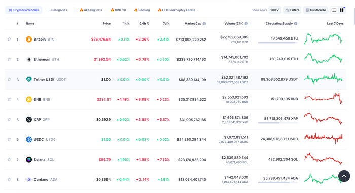 和解的消息传出后,近期刚刚有些上涨势头的加密市场整体普跌,市场再次陷入一片哀嚎。其中,币安平台代币BNB跌幅一度超10%,截至发稿,BNB最新价格为232.81美元,24小时内下跌9.89%。比特币跌破3.7万美元,现报36476.64美元,日内跌幅2.26%;以太坊也跌破2000美元,现报1993.54美元。