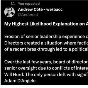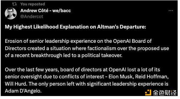 Andrew Cote认为是出于政治原因,Altman之所以被解雇是因为“他或将通过部署最新突破推动人工智能发展得太快。”一些人并不喜欢这样。
