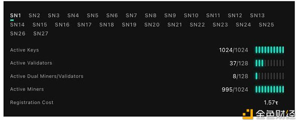 Bittensor仍处于初始阶段。该网络拥有一个虔诚的社区,但参与者规模仍然不大——大约只有5万多个活跃账户。最繁忙的子网SN1专门用于文本生成,有大约40个活跃验证者和990多名矿工。