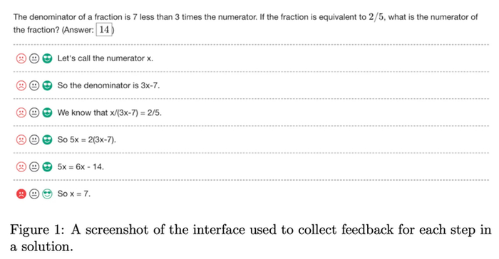 过程奖励模型(PRMs)是 Nathan 在过去 6 个月里从 RLHF 朋友那里听到的一个非公开话题。关于这些模型的文献很多,但关于如何在 RL 中使用这些模型的文献却很少。PRM 的核心理念是为每个推理步骤而不是完整的信息分配分数。下面是 OpenAI 论文《让我们一步步验证》( Let’s Verify Step by Step)中的一个例子: