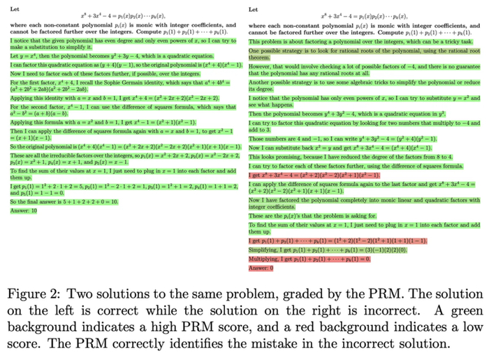 图 2 为同一个问题的两种解决方案,左边答案是正确的,右边的答案错误。绿色背景表示 PRM 得分高,红色背景表示 PRM 得分低。PRM 可以正确识别错误解决方案中的错误。对于错误的解决方案,两种方法都揭示出至少存在一个错误,但过程监督还揭示了该错误的确切位置。
