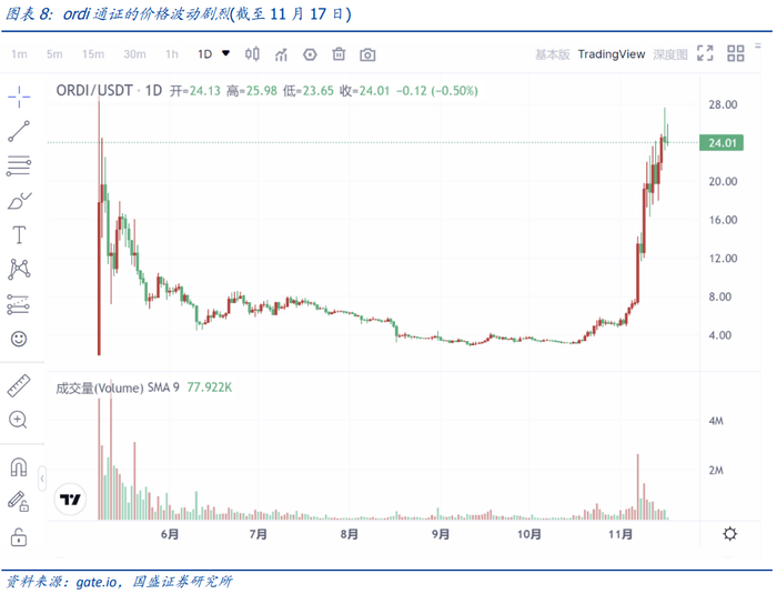 目前来看,主导BRC-20通证价格的更多是市场情绪,并无场景支撑,因此类似ordi通证价格波动剧烈。