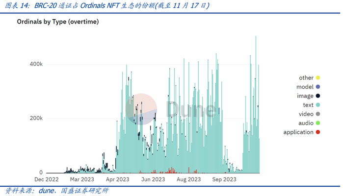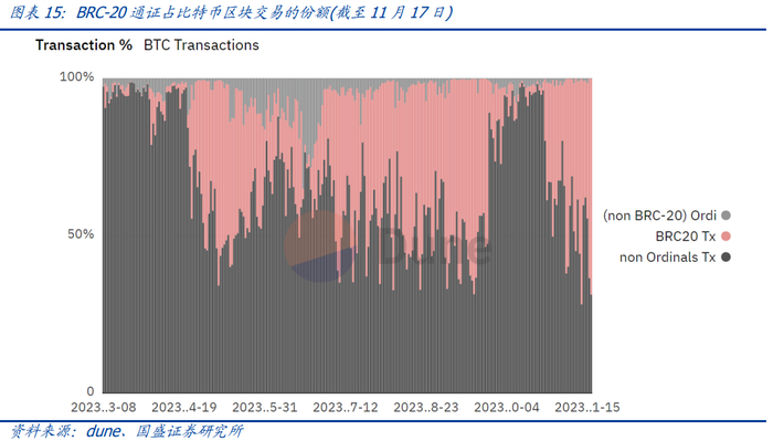 由于BRC-20通证实质上是铭刻了文本数据的Ordinals NFT,且BRC-20通证占文本类Ordinals NFT的绝大部分,我们可以从铭文的分类数据推断出BRC-20通证占整个Ordinals NFT生态的份额大小。根据dune显示的数据,自2023年3月8日BRC-20标准被提出以来,文本类型的Ordinals NFT的铸造量急剧上升,在四月末到五月中旬,甚至几乎没有什么图片类的Ordinals NFT被铸造,截至11月17日,过去已经大半年,BRC-20通证目前仍以文本为绝对的主流。