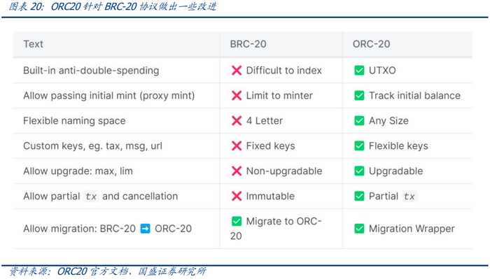 针对BRC-20通证的一些问题,也有社区开发者探索新的标准如ORC20、BRC21等协议来改进。以ORC20为例,主要在通过UTXO模型来确保交易中防双花、允许取消交易以及支持BRC-20向ORC20迁移等。当然ORC20努力向ERC20靠近的结果就是带来了更多的复杂性。而如DeFi中的AMM协议、聚合协议等原生创新目前还未出现,BTC此次创新还处于“复制”以太坊生态的阶段。