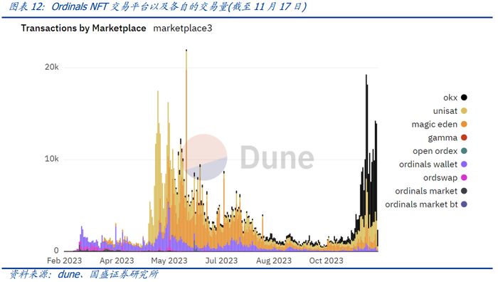 由于市场对于Ordinals NFT存在交易需求,这推动了面对Ordinals NFT的交易平台的诞生。目前,比较流行的几个Ordinals NFT交易平台分别是unisat、ordinals wallet和magiceden。根据dune显示的数据,5月以来Ordinals NFT的日交易量峰值已经超过了1.5万笔,其中在11月之前,unisat所占份额最多,ordinals wallet和magic eden的份额紧随其后。随着10月底BRC-20生态再次火热,OKX平台迅速崛起,引领又一波的市场热度。