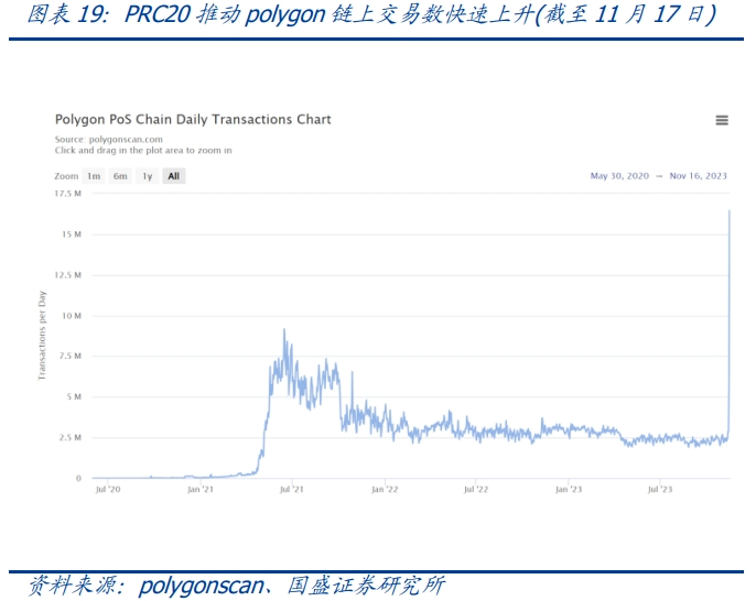具备独特「聪」特质的比特币网络催生了BRC-20代币标准,某种意义上是比特币网络「勉为其难」不得已为之,但以太坊EVM系统生态亦不甘于落后于每一次创新,11月14日至11月15日期间,以太坊EVM生态重要的区块链——Polygon的链上交易数量从289万笔飙升至 617万笔,此后持续走高,甚至创历史新高,推动网络交易费用快速上升。