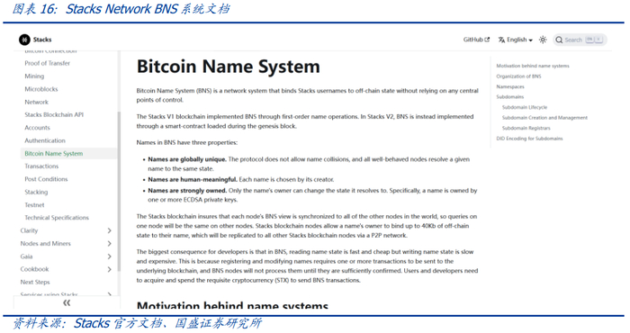 对于基于Stacks Network的BNS(Bitcoin Name System),Stacks官方文档中显示BNS是一种可以不依赖于任何中心节点,而将Stacks用户名与链下状态绑定的网络系统。在BNS中,协议不允许名称冲突,这意味着名称是全局唯一的;名称具有强所有权,即只有名称的所有者才能更改其解析的状态。另外,由于Stacks是一个可以运行智能合约的比特币L2(二层网络),BNS的使用能更多地与智能合约相结合。但是需要注意的是,基于Stacks Network的BNS并不能直接与比特币网络交互。