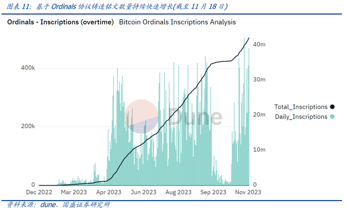 根据dune显示的数据,自2022年Ordinals协议发布以来,比特币Ordinals铭文的铸造量快速增长,而近一个月铸造的增长量更是惊人。截至2023年11月18日,单日比特币铭文的铸造量峰值达超过41万个,而比特币铭文的总铸造量已经接近4200万个。