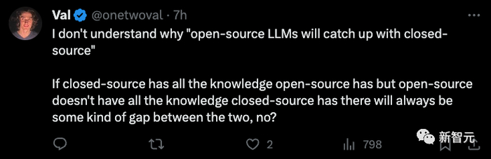 「不明白为什么开源和闭源的差距会缩小。毕竟开源模型的所有知识和技术是共享的,而闭源AI总有他们独有的东西。」