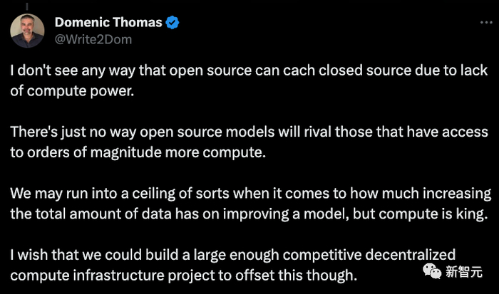 「由于开源和闭源在算力上的巨大差距,开源要想赶上闭源,还很困难。」