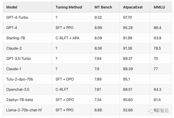 伯克利团队最近公布的Starling-7B,通过RLAIF的方式,在某些基准测试中超越其他的所有模型,接近GPT-4的水平