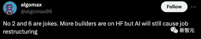 第二条和第六条都是笑话,虽然Hugging Face上会出现更多的开发者,但是AI依然会重构劳动力市场。