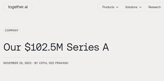 11月30日,开源生成式AI平台Together AI在官网宣布,获得1.025亿美元(约7.3亿元)A轮融资。本次由凯鹏华盈 (Kleiner Perkins) 领投,英伟达、Emergence Capital、 NEA、Prosperity 7、Greycroft等跟投。