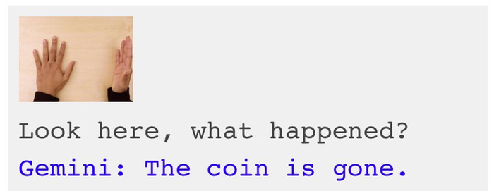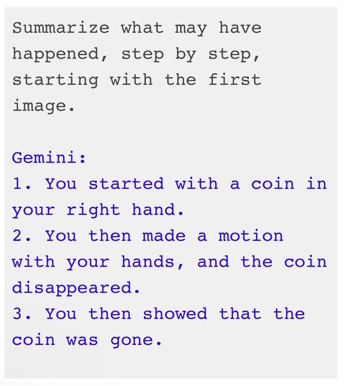 把硬币变没后,Gemini Ultra能够一步步总结刚刚所看的所有过程。