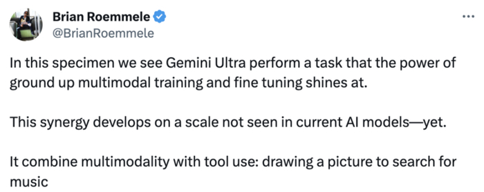 这种协同作用的发展规模在目前的人工智能模型中尚属首次。它将多模态与工具使用相结合:画图搜索音乐。