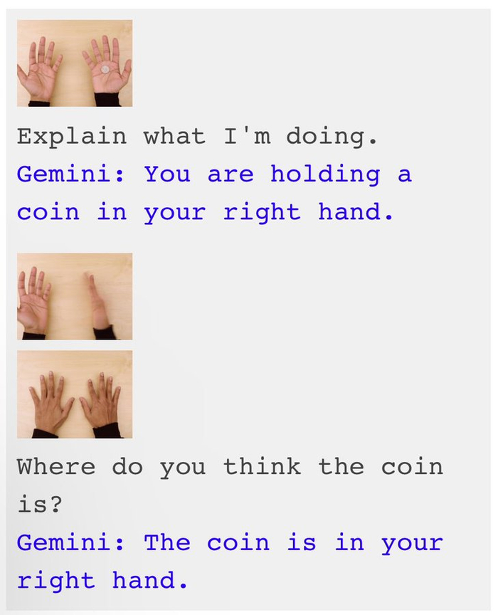 接下来,就是见证奇迹的时刻了。给到一个右手拿硬币的图,让Gemini去描述。