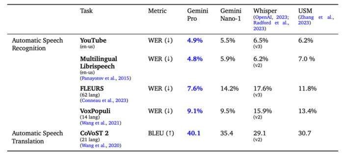 语音基准上的评估结果,Gemini Pro在语音识别,以及自动语音翻译都优于其他模型。